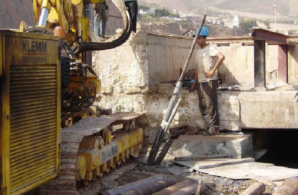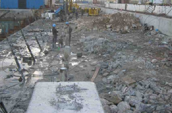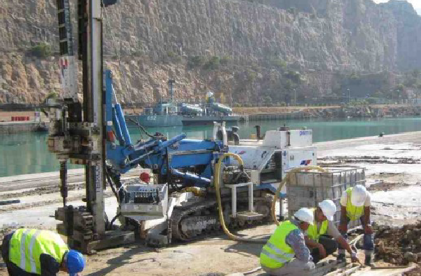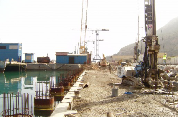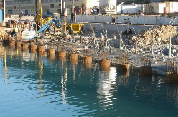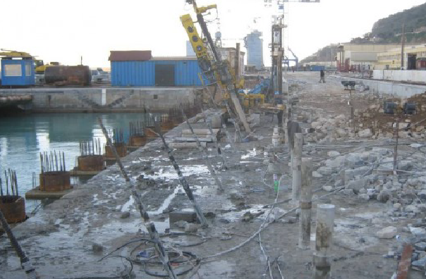 Reforço e recalçamento de fundações de muro cais e das vigas de fundação de guindastes, recorrendo a microestacas e a colunas de jet grouting.