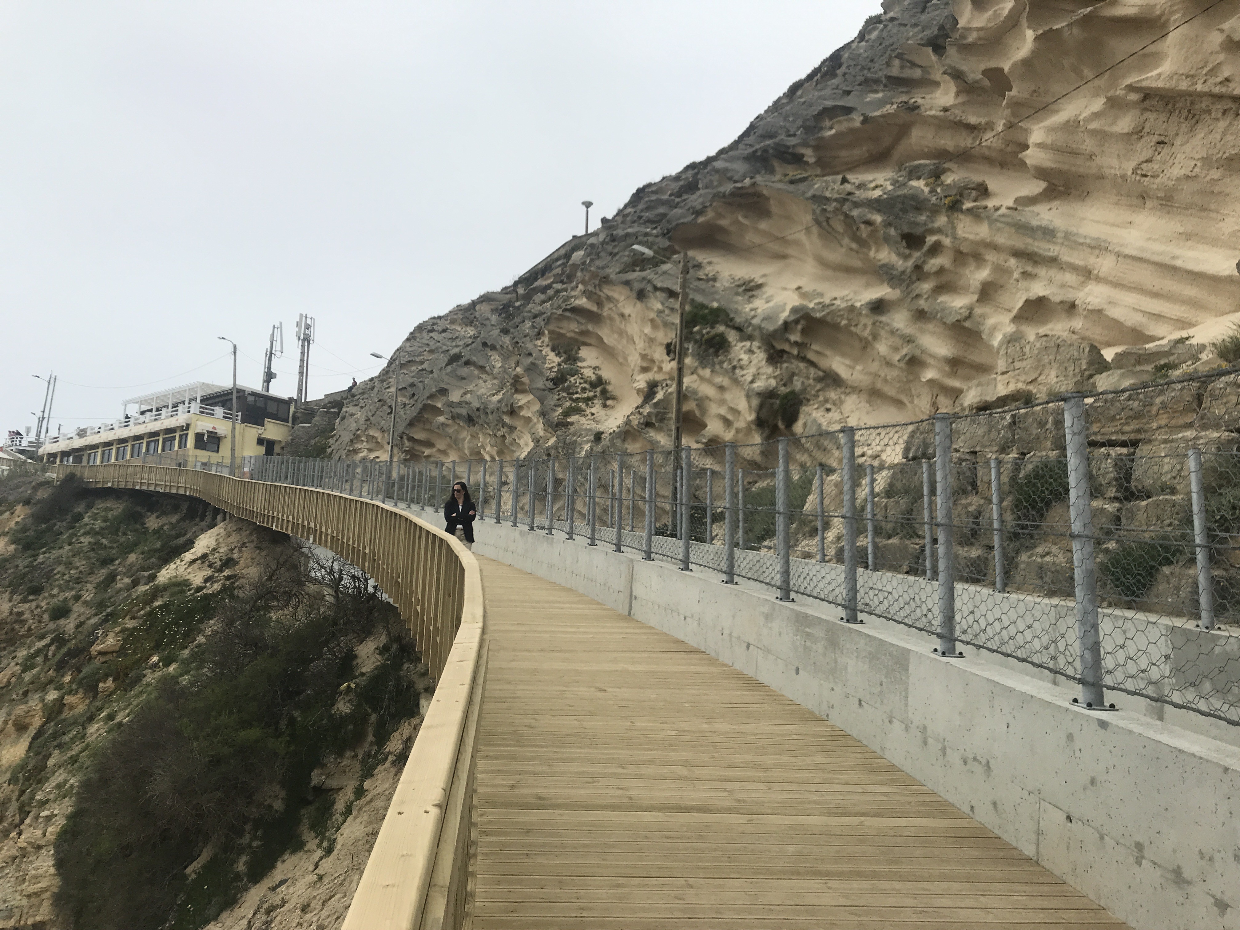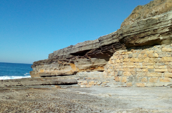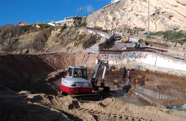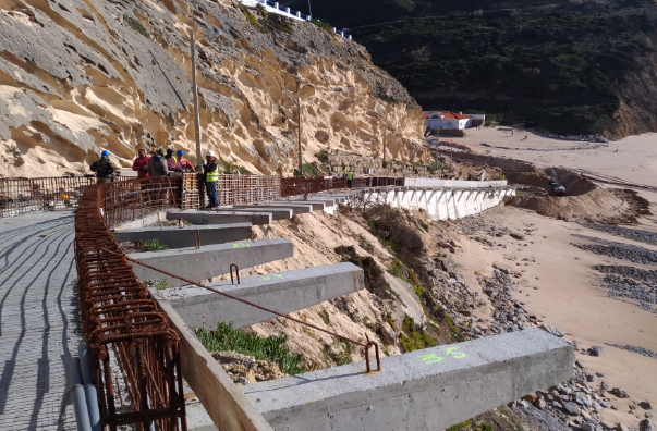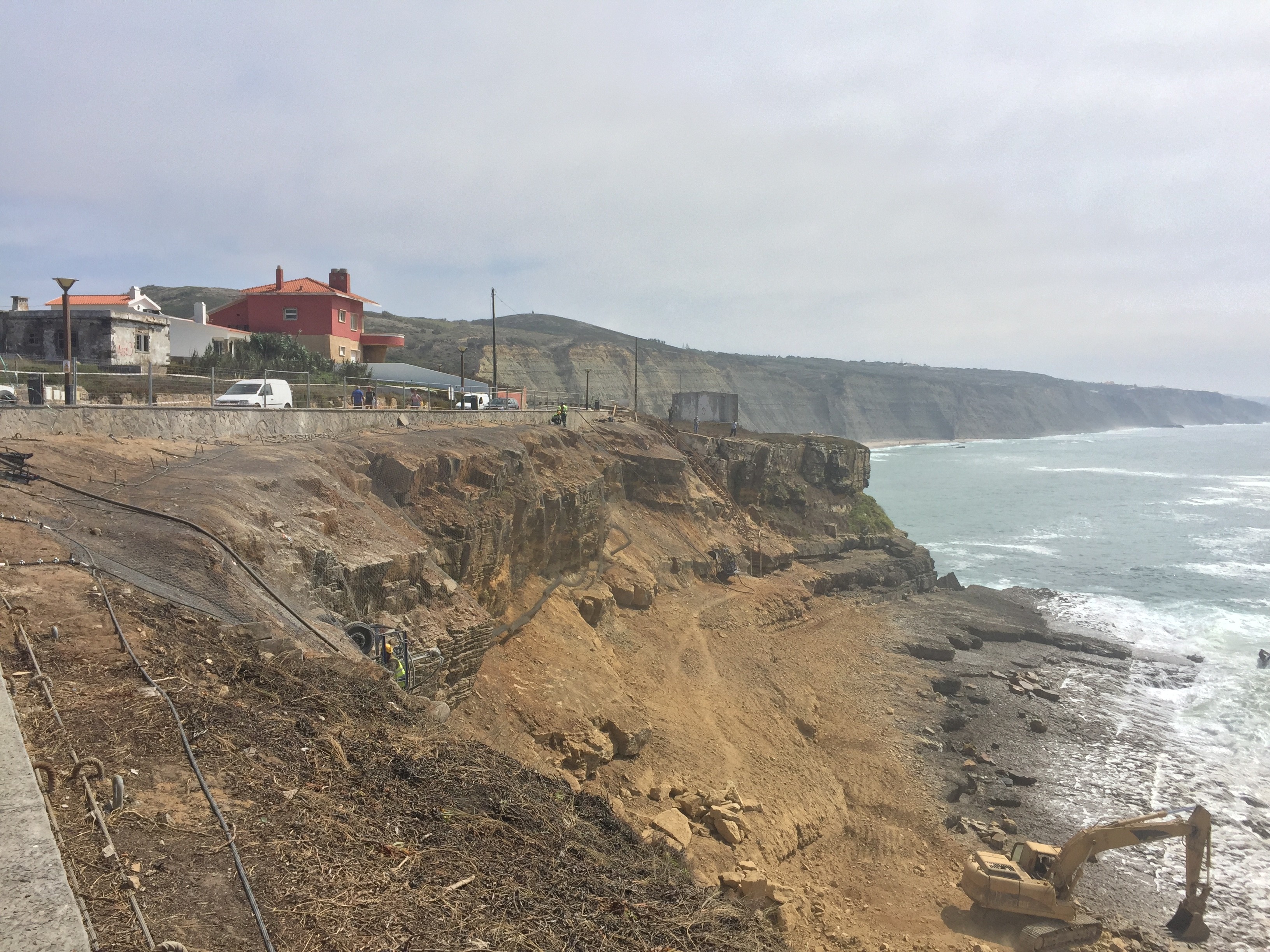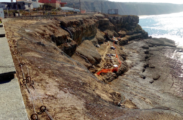 Estabilização de arriba com recurso a redes pregadas e reabilitação da rampa de acesso à praia, incluindo a construção de um novo passadiço balançado sobre a arriba e fundado em microestacas.