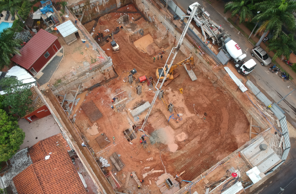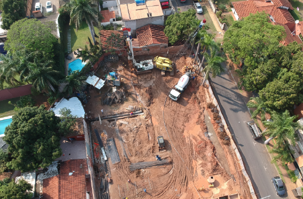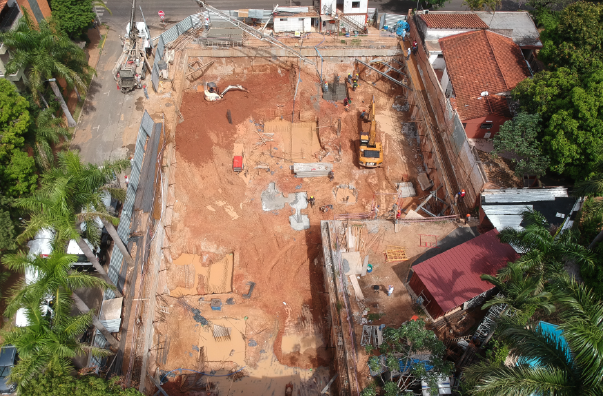 Projeto de contenção periférica de dois pisos enterrados com recurso à tecnologia de parede moldada travada com ancoragens provisórias. Altura de escavação máxima 7m.