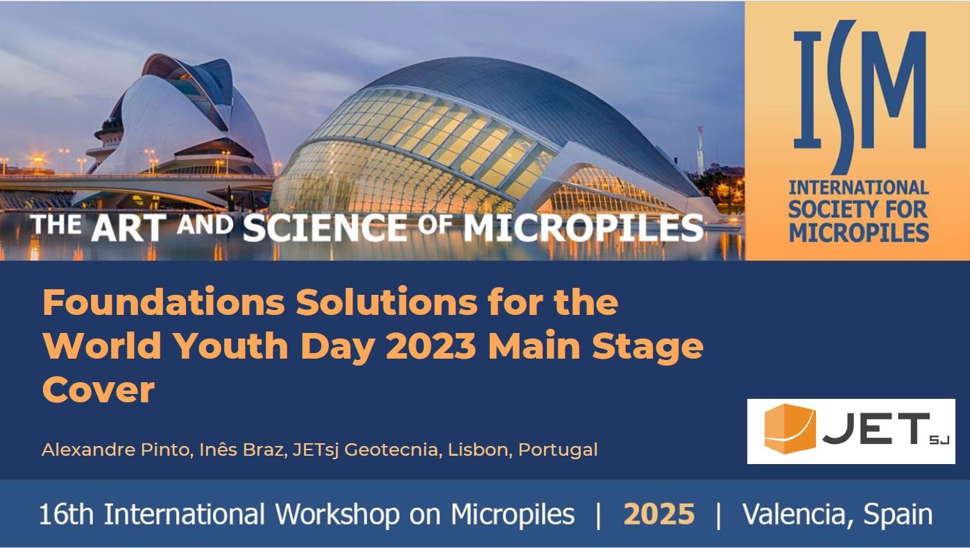 A JETsj Geotecnia, Lda esteve presente no 16º Workshop Internacional sobre Microestacas, organizado pela International Society for Micropiles, que teve lugar no Palau de Les Arts, Valência, Espanha, com a apresentação, por Alexandre Pinto, do trabalho com o título: Foundations Solutions for the World Youth Day 2023 Main Stage Cover.