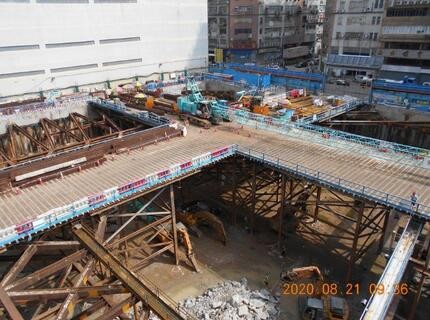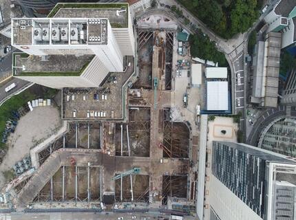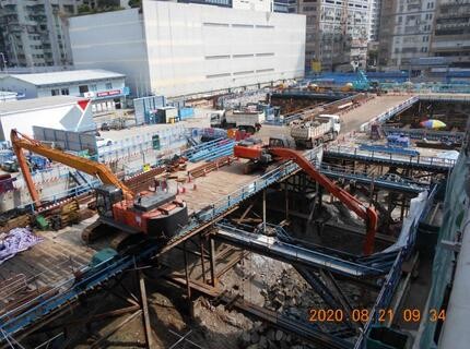 Escavação e contenção periférica para construção de 3 pisos enterrados para edifício em Macau, com recurso a cortina de estacas e de colunas de jet grouting, travada por escoramentos de grande vão